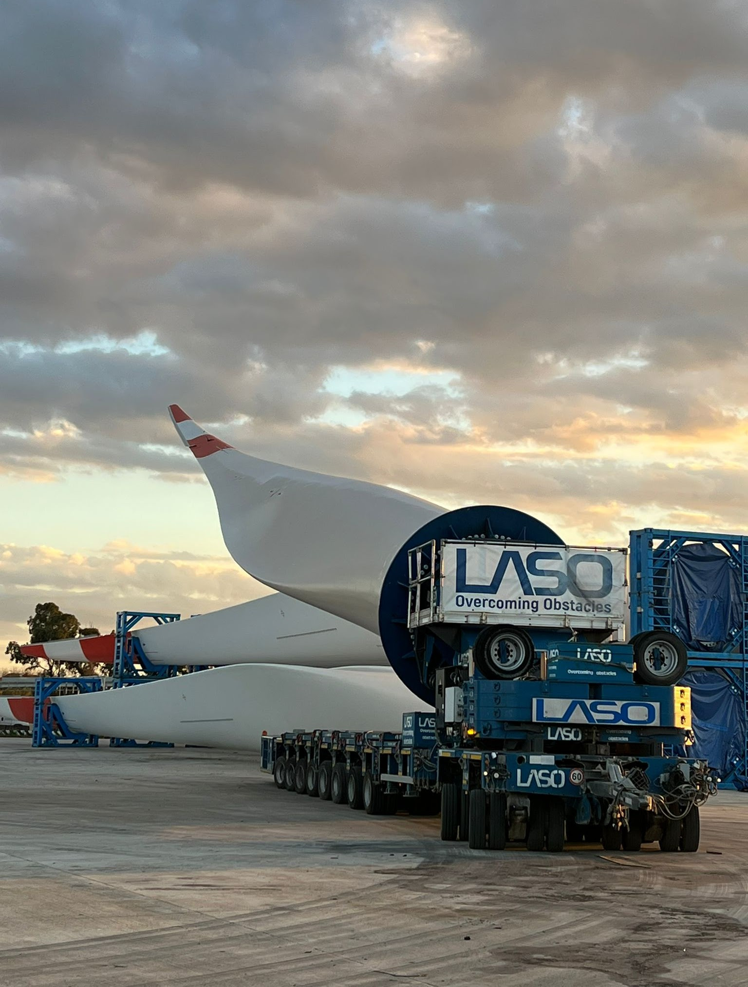 Para superar os desafios do percurso, com mais de 60 quilómetros entre o porto e o destino final, a LASO recorreu à tecnologia Blade Lifter, que permite elevar e girar as pás durante o transporte, tornando possível a passagem por zonas urbanas, estradas estreitas e troços com forte inclinação.