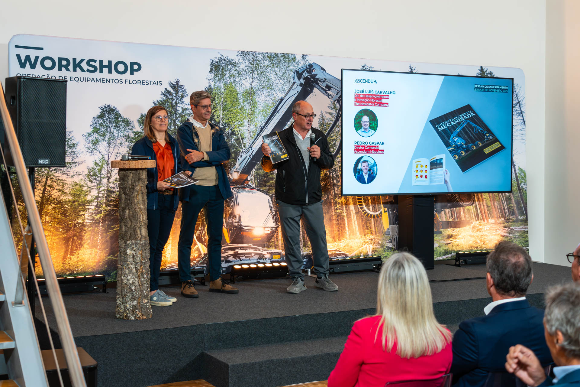 Um dos momentos mais relevantes do evento foi a apresentação do Manual de Colheita Florestal Mecanizada, obra original de Heikki Ovaskainen e agora disponibilizada numa edição adaptada à realidade portuguesa. Essa adaptação e revisão técnica resultou de um trabalho conjunto entre Susana Morais e José Luís Carvalho, da The Navigator Company, Jorge Cunha, da ForestWISE, e Gonçalo Ferreira, da Biond, cuja experiência permitiu ajustar o documento às especificidades operacionais, ambientais e regulamentares da floresta nacional. A apresentação do manual esteve a cargo de Pedro Gaspar (Ascendum) e de José Luís Carvalho, que destacaram a importância desta ferramenta para apoiar uma mecanização mais segura, eficiente e sustentável.