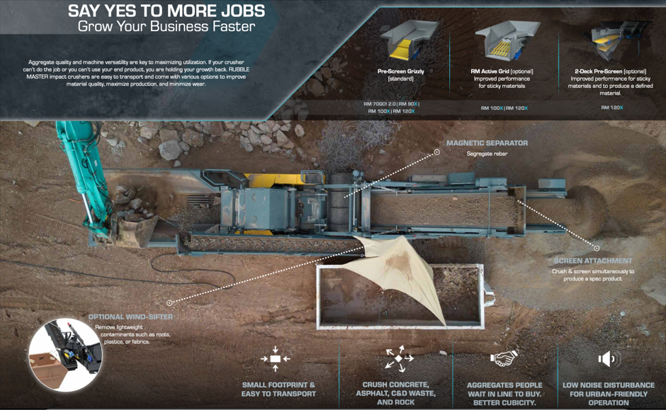 De acordo com a informação disponibilizada pelo fabricante, os trituradores móveis por impacto Rubble Master estão indicados para operações de reciclagem de resíduos da construção e demolição, bem como para a trituração de betão e asfalto. Estes equipamentos podem também ser utilizados no processamento de rocha natural e na produção de agregados destinados à reutilização em obra.
