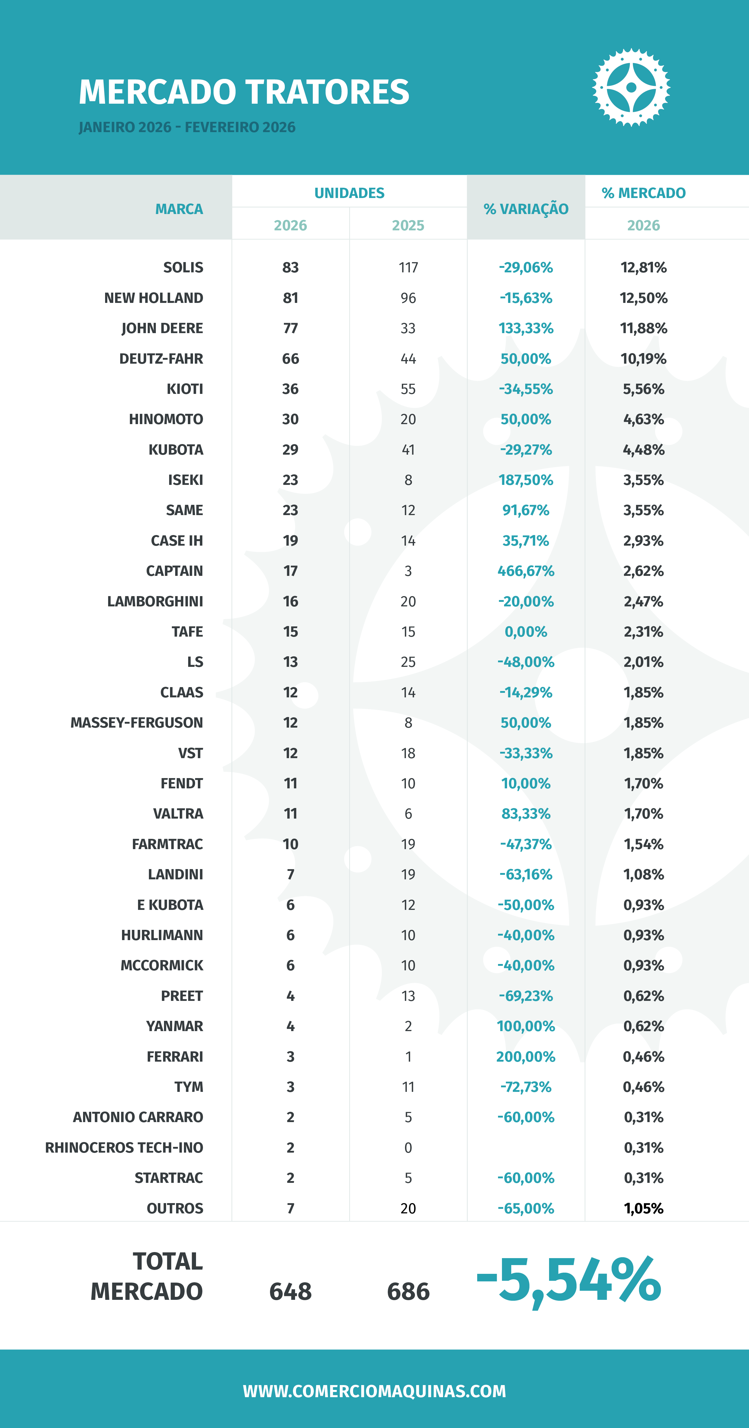 Também a Deutz-Fahr apresentou uma evolução favorável, com 32 unidades matriculadas, correspondendo a um crescimento homólogo de 60%. A Hinomoto, a SAME e a Iseki registaram igualmente aumentos expressivos em termos percentuais, ainda que com volumes mais reduzidos.