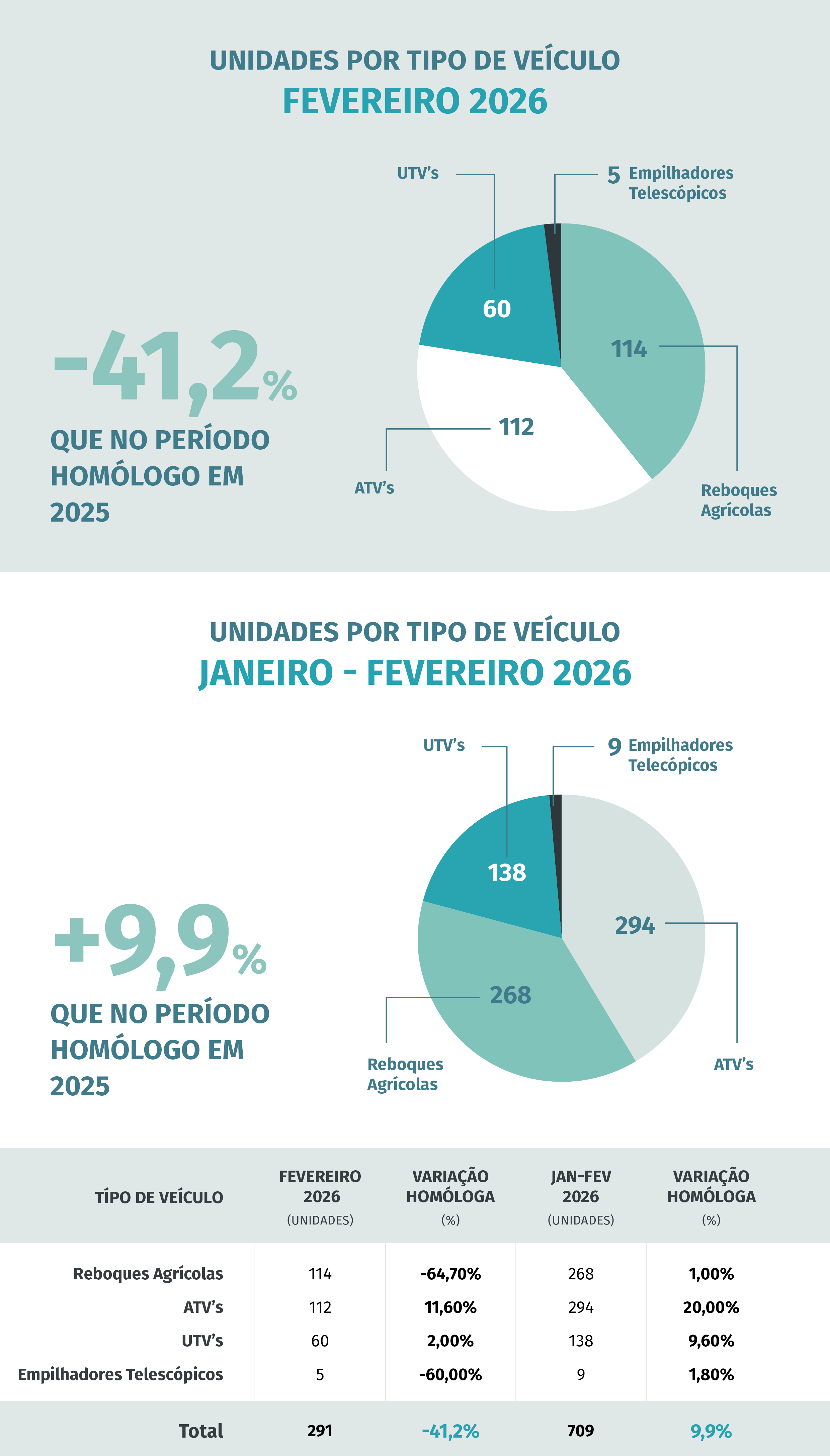 Apesar da queda registada no mês, o desempenho acumulado dos dois primeiros meses do ano apresenta uma descida mais moderada. Entre janeiro e fevereiro de 2026 foram matriculados 648 tratores agrícolas, menos 5,5% do que no mesmo período de 2025.