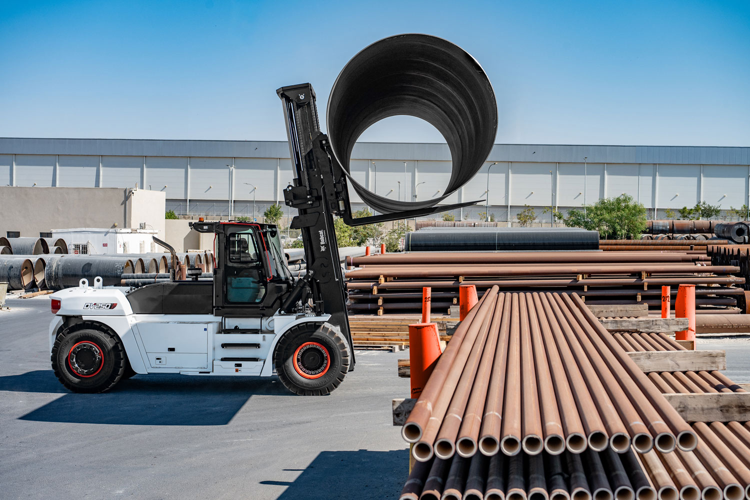 Entre as principais características e vantagens dos empilhadores diesel Bobcat DV180/250S-9 Série 9 destaca-se a elevada capacidade de elevação, que atinge 18 e 25 toneladas, respetivamente, com um centro de carga de 1.200 mm, uma solução particularmente adequada para operações pesadas de grande escala.