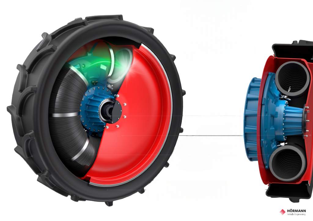 A solução desenvolvida pela Hörmann Vehicle Engineering propõe a integração de depósitos de hidrogénio gasoso diretamente nas rodas do veículo. Mais do que uma simples alteração de layout, trata-se de uma redefinição do conceito de aproveitamento de espaço. As rodas deixam de ser apenas um componente mecânico e passam a assumir um papel ativo no sistema energético da máquina.