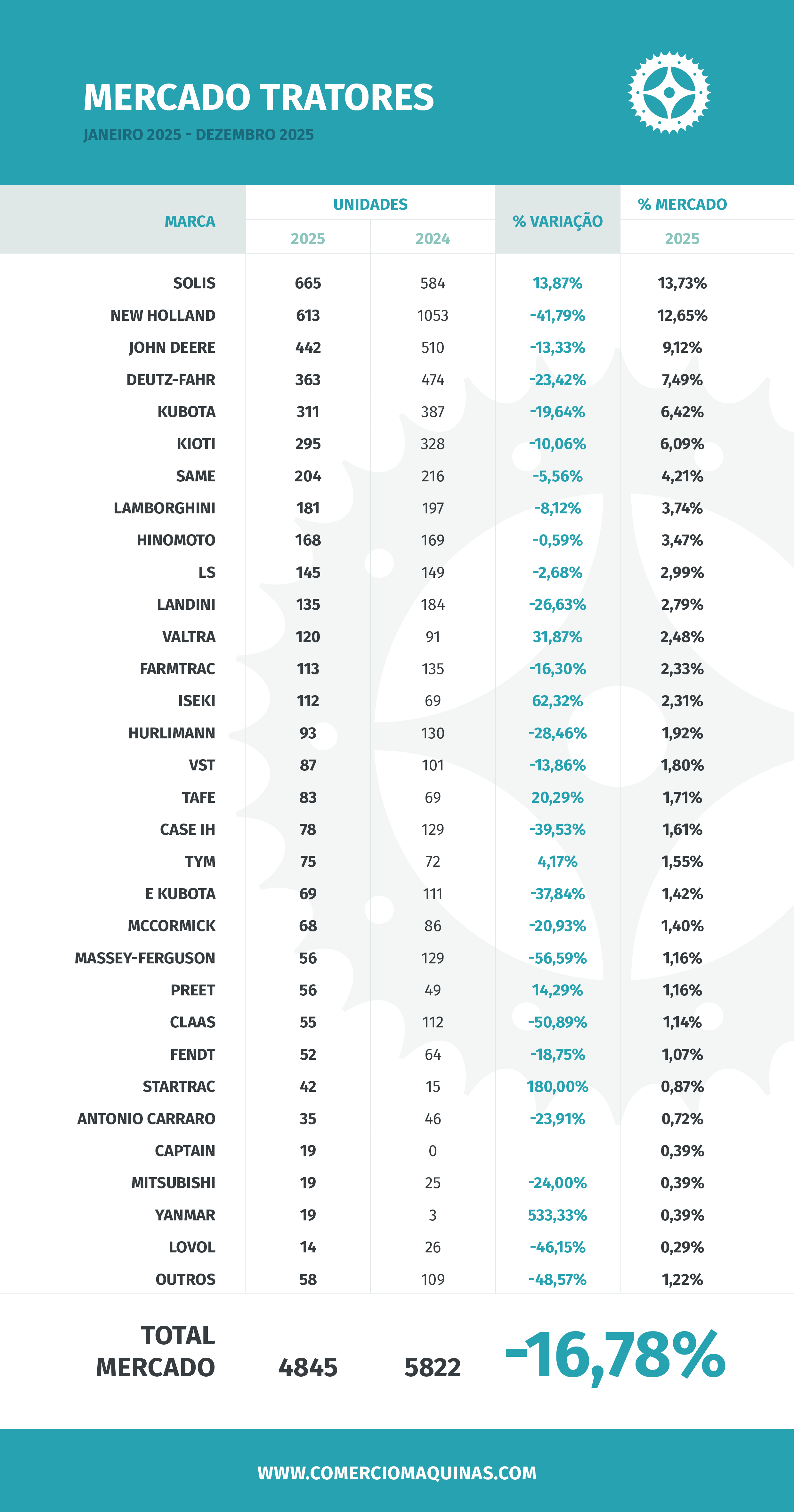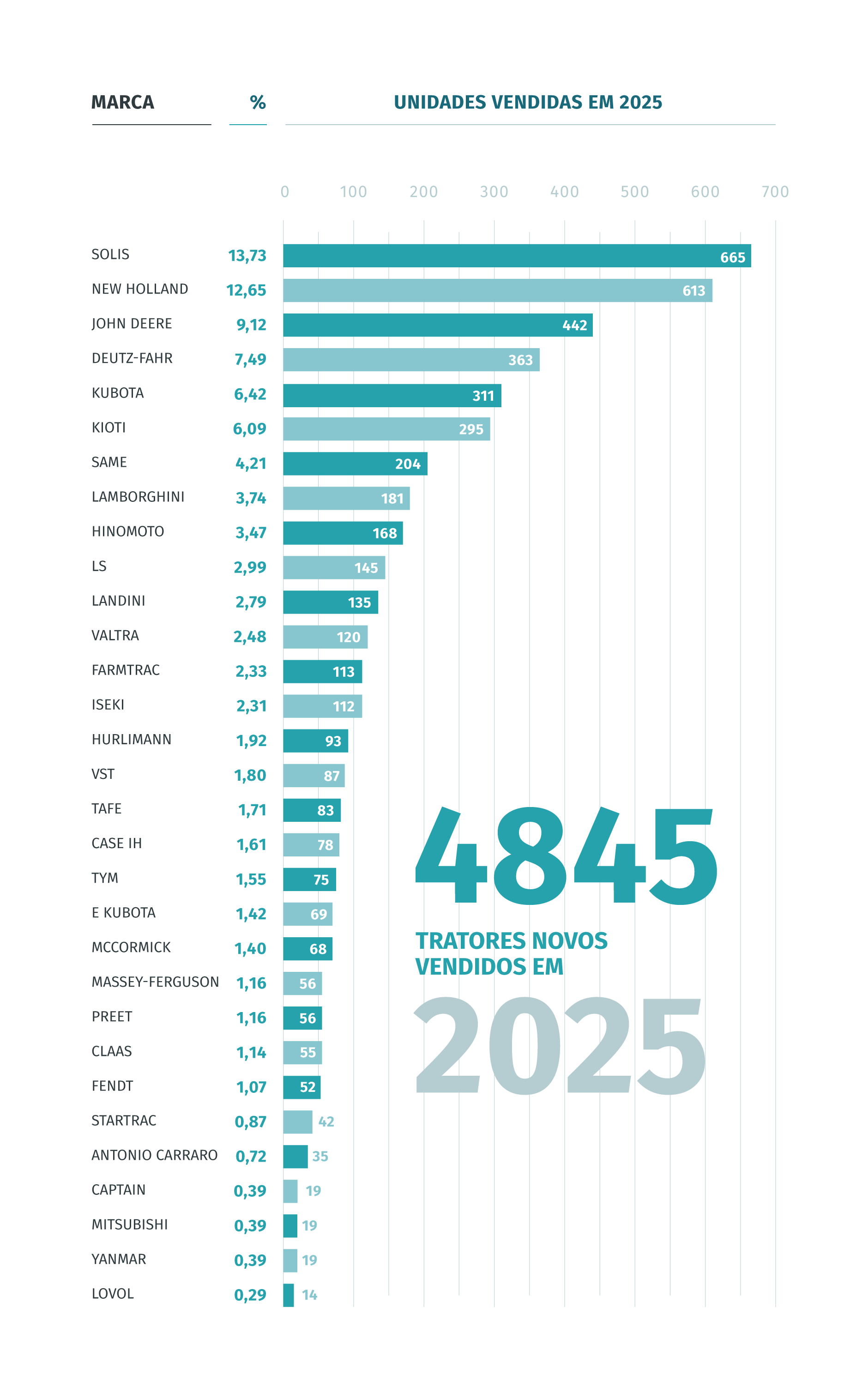 A New Holland, apesar de manter a segunda posição no ranking, foi uma das marcas mais penalizadas em termos absolutos. Com 613 unidades vendidas, registou uma quebra de 41,8% face a 2024, ano em que tinha superado largamente a fasquia das mil unidades. Ainda assim, manteve uma quota de mercado relevante, de 12,65%.