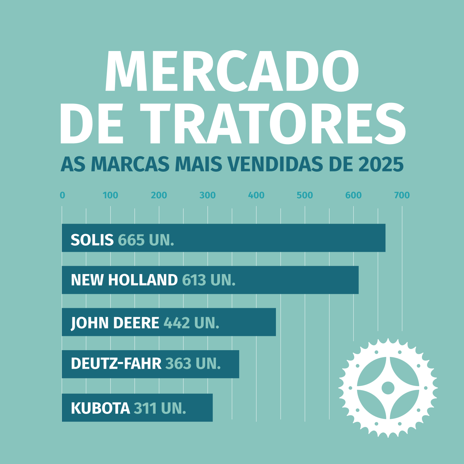 A John Deere terminou o ano em terceiro lugar, com 442 unidades matriculadas, menos 13,3% do que no exercício anterior. Já outros fabricantes históricos apresentaram quebras significativas, como Deutz-Fahr (-23,4%), Kubota (-19,6%), Landini (-26,6%), Case IH (-39,5%), Massey Ferguson (-56,6%) e Claas (-50,9%).