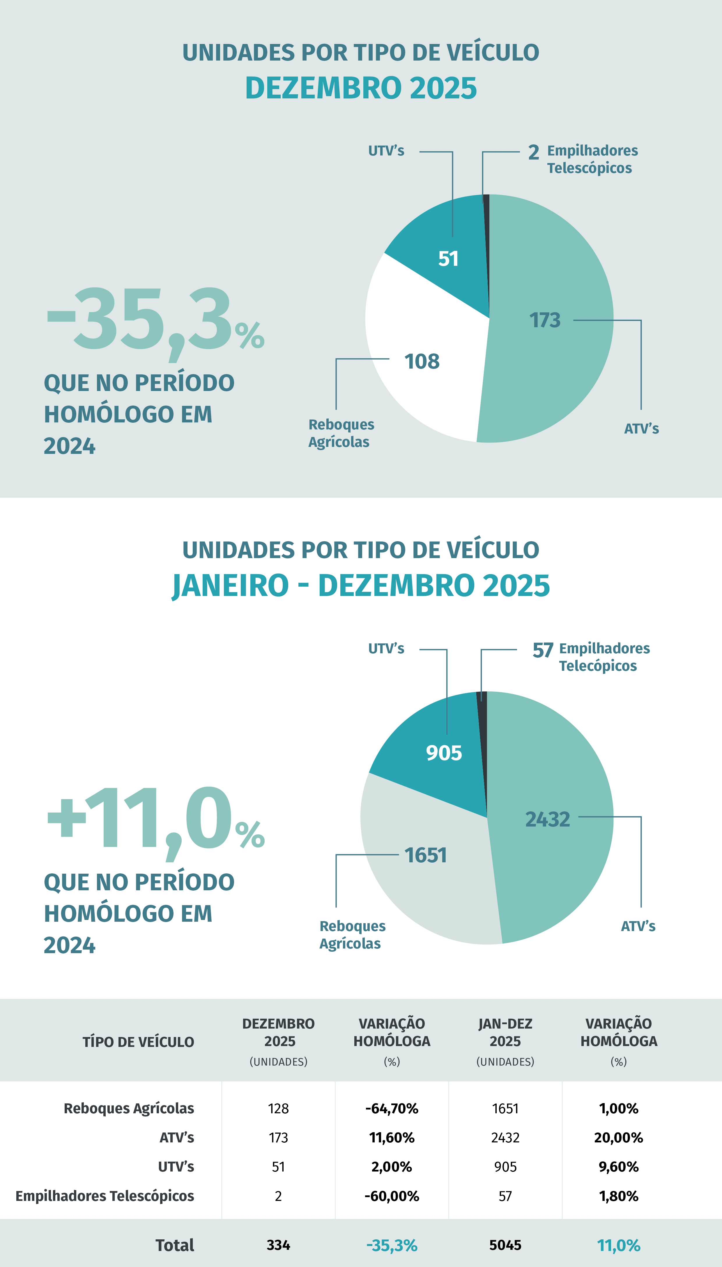 O mês de dezembro trouxe algum alívio estatístico, com 460 tratores matriculados, correspondendo a um crescimento homólogo de 9,5%. Este desempenho positivo no último mês do ano não foi, no entanto, suficiente para inverter a tendência negativa acumulada, evidenciando que o mercado operou grande parte de 2025 num registo defensivo e altamente seletivo.